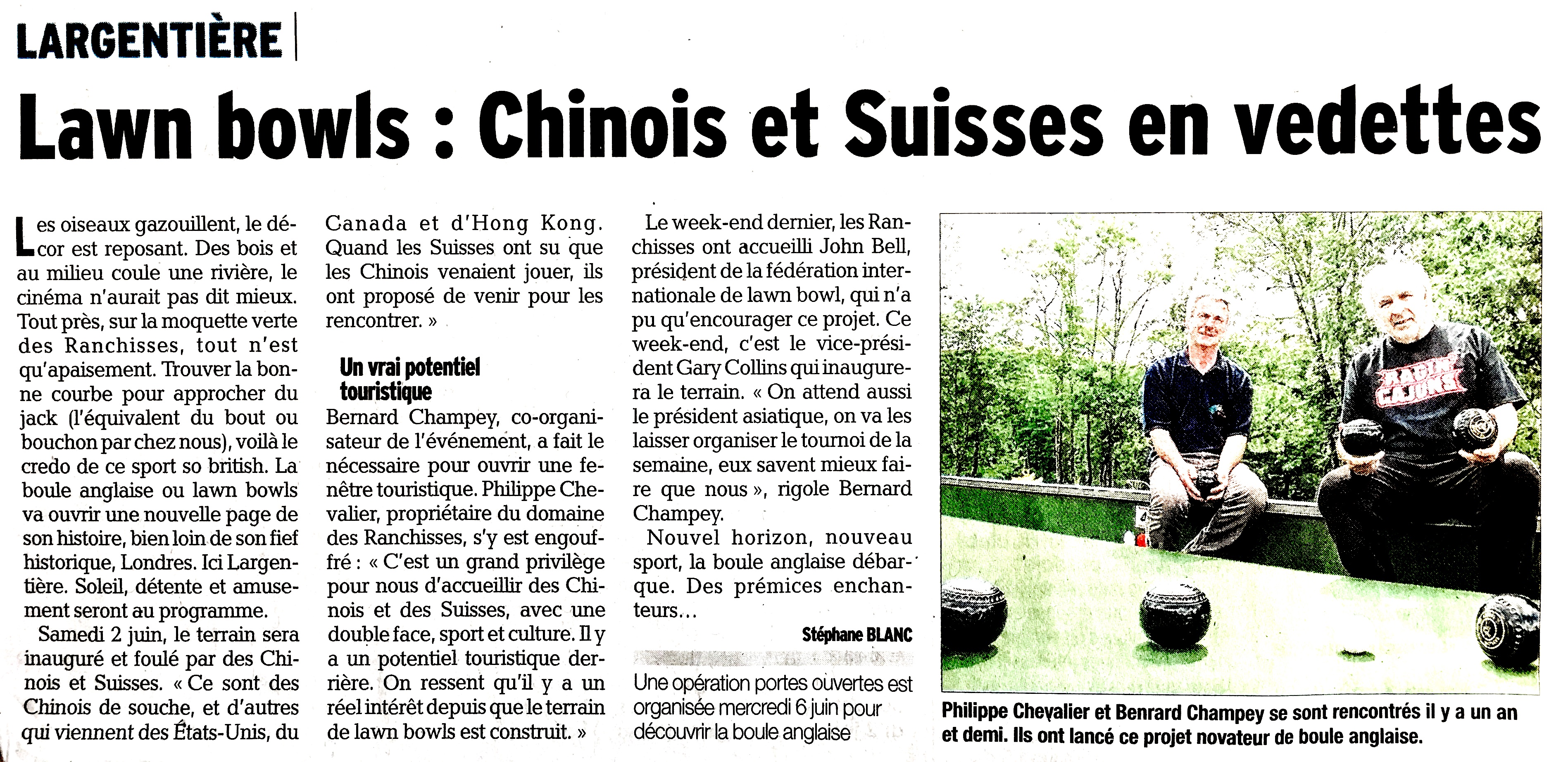 Lawn Bowls : Chinois et Suisses en vedettes Juin 18, 2018 Le Dauphiné Libéré Sud-Ardèche – 31 mai 2018 Poster le commentaire Annuler la réponseVotre adresse e-mail ne sera pas publiée. Les champs obligatoires sont indiqués avec *Commentaire * Nom * E-mail * Site web Enregistrer mon nom, mon e-mail et mon site dans le navigateur pour mon prochain commentaire. Saisissez votre réponse en chiffres5 × 2 =